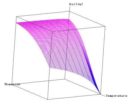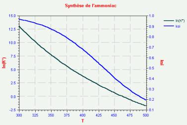 Synthèse de l’ammoniac : tracé de ln(K°) et de xeq en fonction de la température ainsi que d’une surface 3D rendement en fonction de la pression et de la température. |