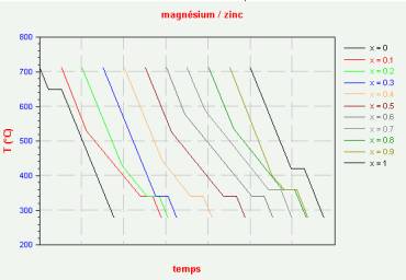 Tracé du diagramme binaire magnésium/zinc et des courbes de refroidissement correspondantes. |