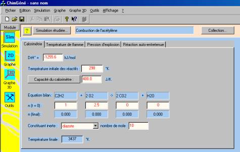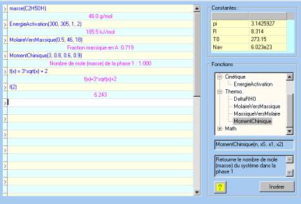 En thermodynamique : Calcul de température de flamme, de pression d’explosion… Étude d’un équilibre sous forme ‘expérimentale’ : bilan ; étude de x, p, A, ni… en fonction des différents paramètres ; réseaux de courbes, surfaces 3D ; recherche de grandeurs thermodynamiques… En quelques clicks, possibilité de créer un diagramme binaire, ses courbes d’analyse thermique et de l’introduire dans un exercice…