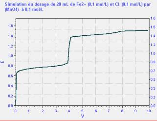 Dosage rédox du fer(II) par le permanganate : courbe E = f(V). |