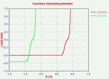 Allure des courbes intensité-potentiel pour le système cuivre/zinc. |